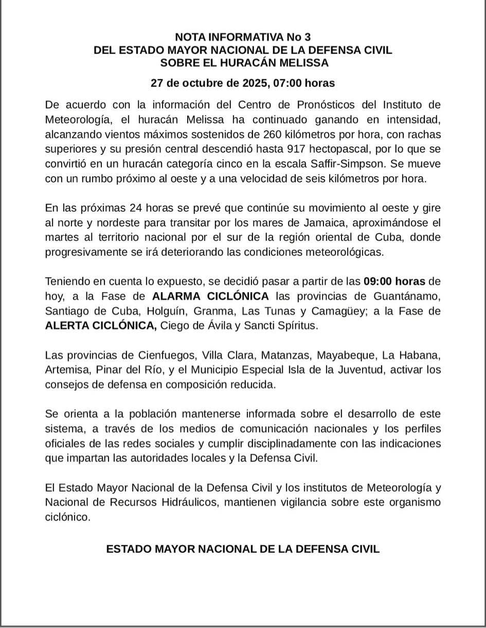 Alarma ciclónica, Cuba, Huracán Melissa, temporada ciclónica publishlocal 27 octubre, 2025 Decreta Defensa Civil fase de Alarma Ciclónica para el Oriente de Cuba