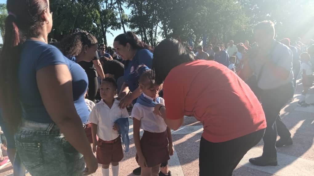 En la conmemoración, cerca de 100 alumnos de diferentes centros escolares, recibieron la pañoleta azul, simbolo que los convierte en miembros de la Organización de Pioneros José Martí.