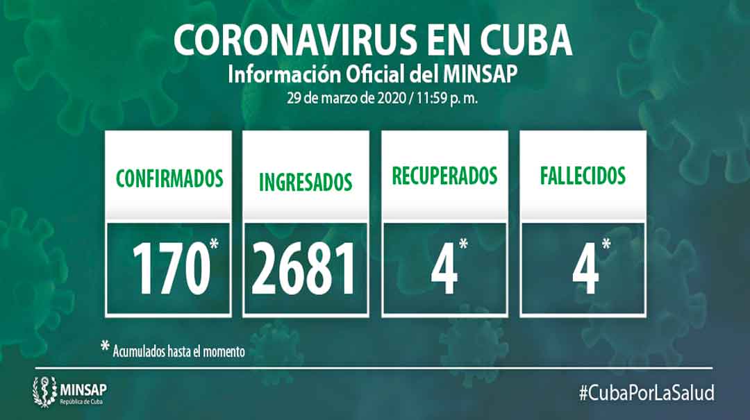 Ciudadano cubano de 45 años de edad, residente en el municipio Ranchuelo, provincia Villa Clara. Contacto de viajero procedente de Panamá. Comenzó el 26 de marzo con síntomas, el día 27 fue ingresado Hospital “Manuel Piti Fajardo”. Mantiene evolución satisfactoria hasta el momento. Se encuentran en vigilancia 12 contactos de este paciente.