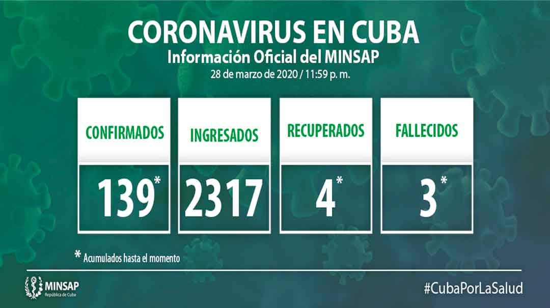 Ciudadano cubano de 32 años, reside en Habana del Este, provincia La Habana. Arribó al país el 21 de marzo procedente de Estados Unidos. Comenzó el 21 de marzo con síntomas. En la pesquisa del día 24 fue identificado, como caso sospechoso, siendo remitido e ingresado en el Hospital “Luis Díaz Soto”. Mantiene evolución satisfactoria hasta el momento. Se encuentran en vigilancia 12 contactos de este paciente.